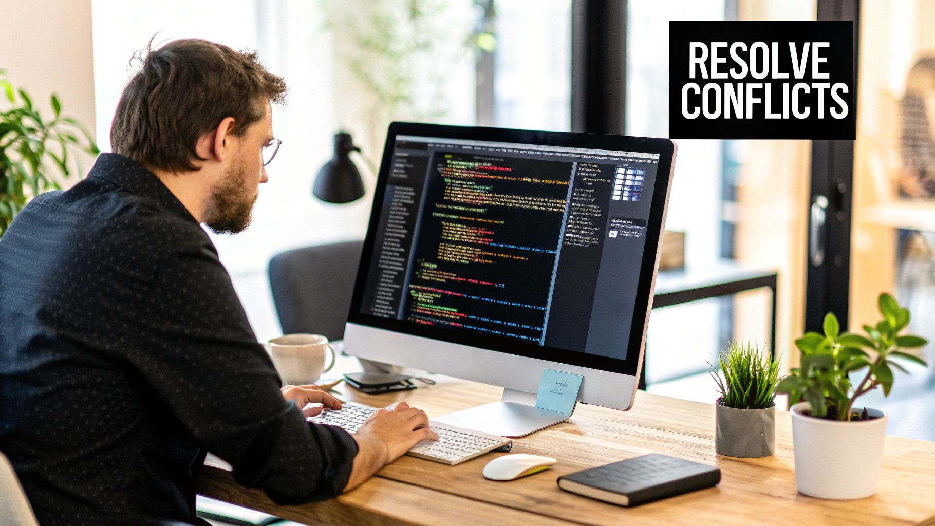 Think of it like two authors trying to write different sentences on the same line of a document. The system can’t just guess which one is right, so it flags the line for review. Getting comfortable with this process is a core skill for anyone learning how to merge GitHub branches.
