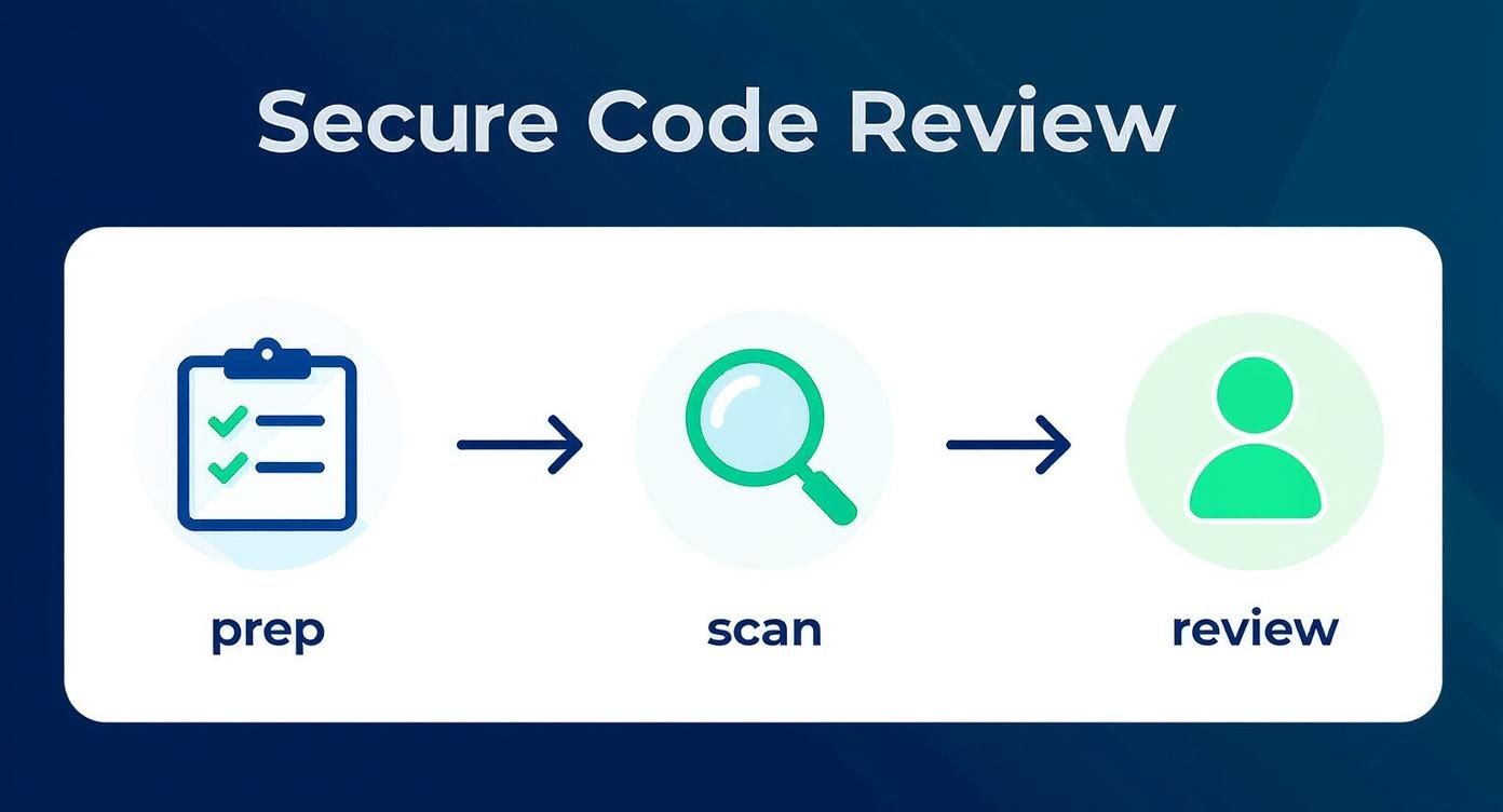 This visual flow shows the core stages of a secure code review, from preparation and automated scanning to the critical manual review phase.